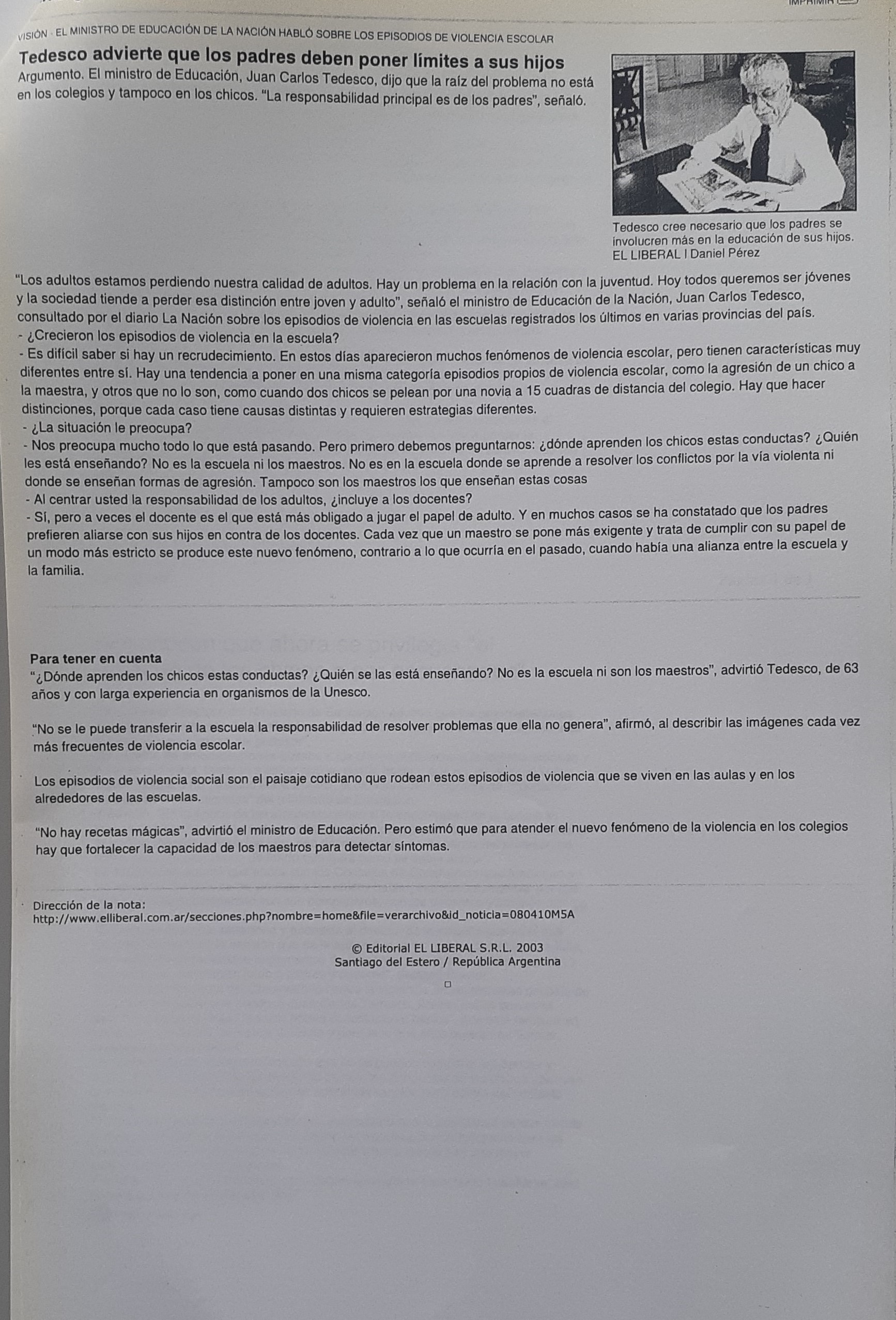 Educ.ar (diciembre de 2003). "Juan Carlos Tedesco: los problemas son básicamente morales". Educ.ar.