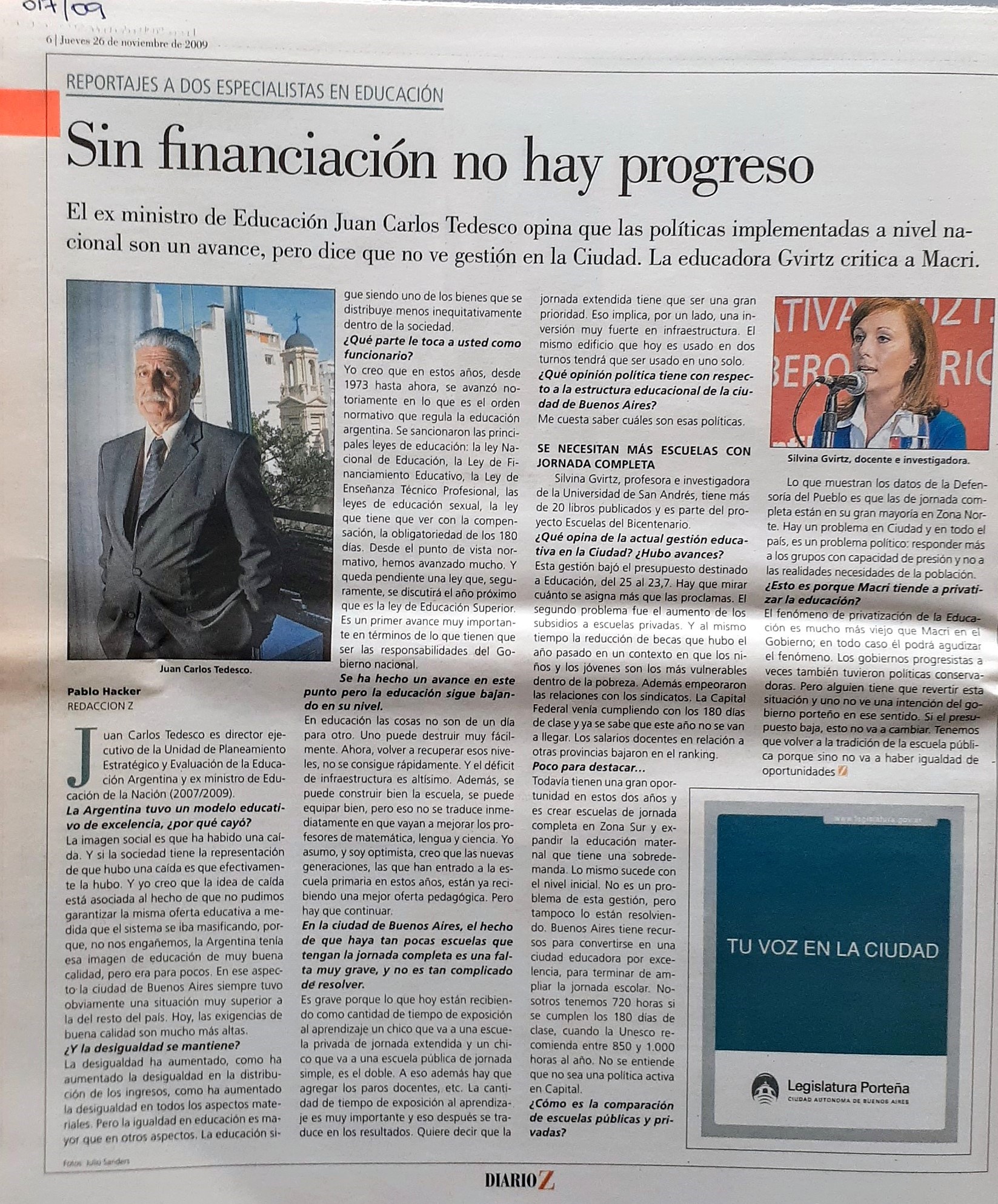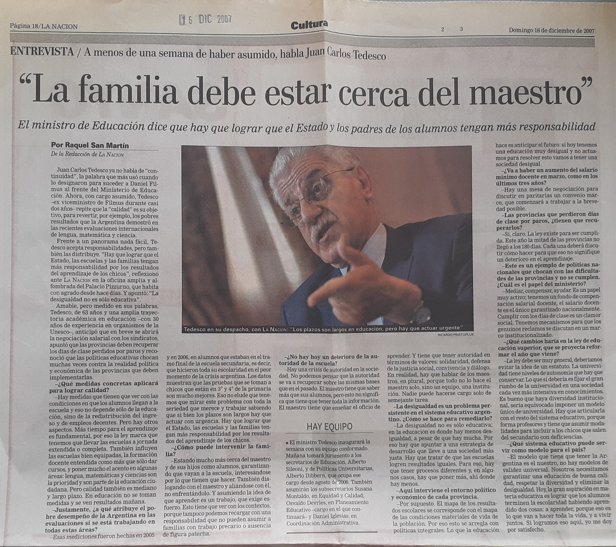 Dillon, A. (8 de octubre de 2015). Entrevista a Juan Carlos Tedesco. "La política educativa debe hacerse responsable por los resultados". Clarín.