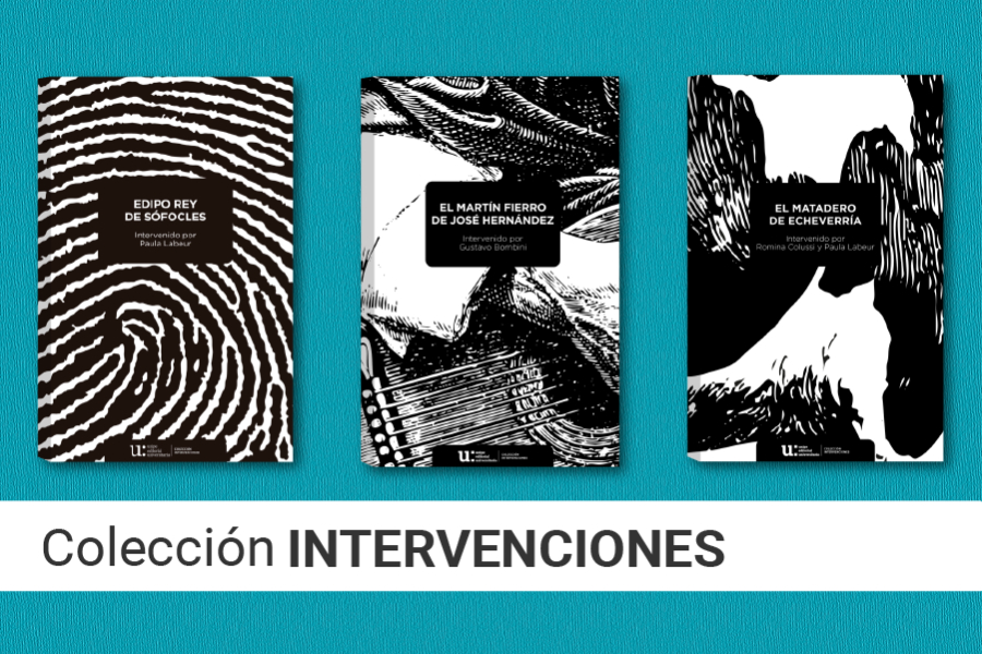 La colección Intervenciones nos propone leer un texto clásico (publicado de forma íntegra) en paralelo a otros discursos contemporáneos: se trata de fotografías, canciones, artículos periodísticos o científicos que interpelan, reformulan e invitan a reescribir obras como Edipo rey, el Martín Fierro, Hamlet o La metamorfosis. En esta colección, el clásico funciona como parte de una trama en la que se tejen otras voces que podrían venir a nuestra mente cuando levantamos la vista de la lectura y volvemos a nuestro mundo.